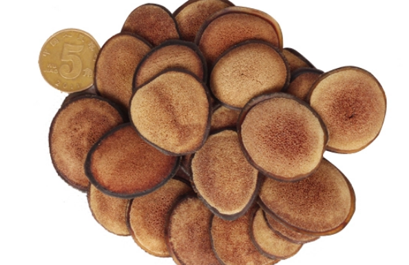 假鹿茸:类似圆形,但厚薄不均,外皮呈灰褐色,切断面棕紫色,无蜂窝状细孔,偶有圆点。